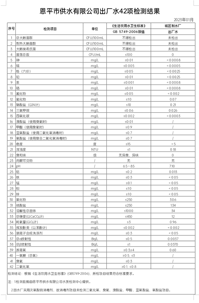 2023年1月出厂水42项检测结果