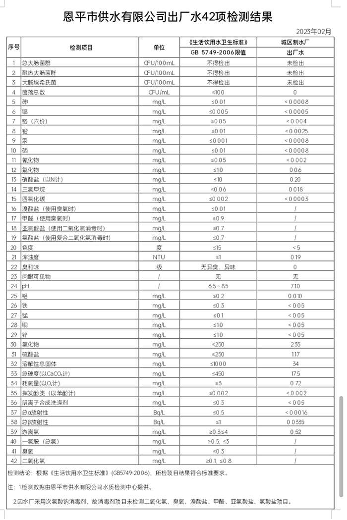 2023年2月出厂水42项检测结果