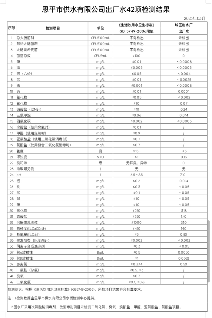2023年3月出厂水42项检测结果