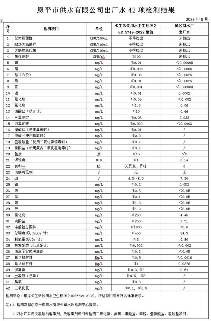 2023年8月出厂水42项检测结果