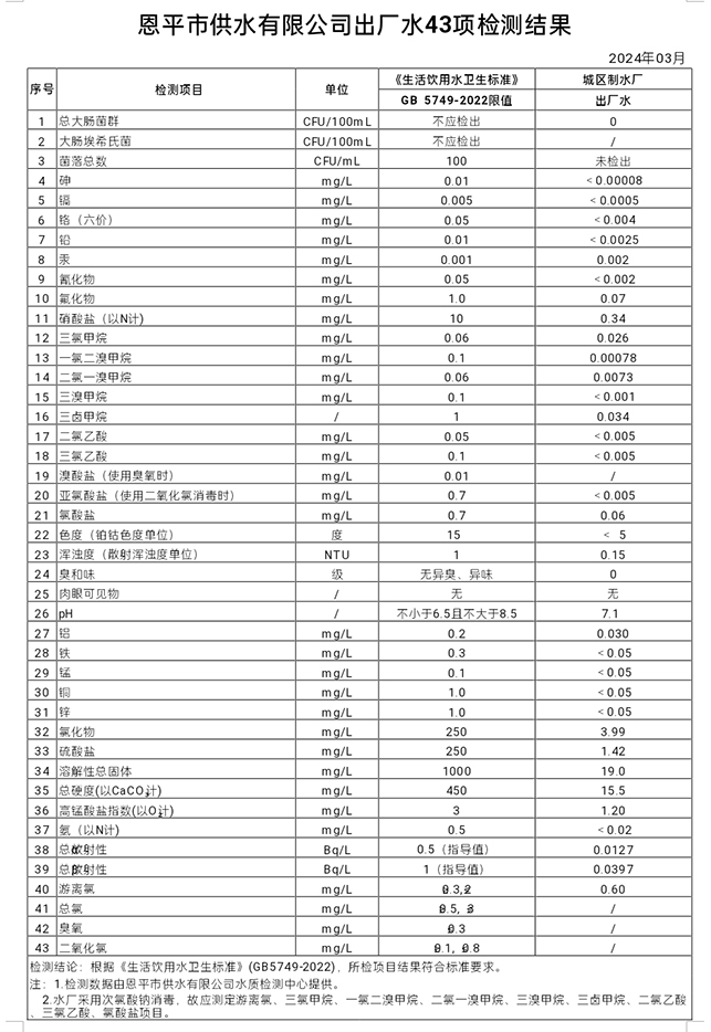 2024年3月出厂水43项检测结果