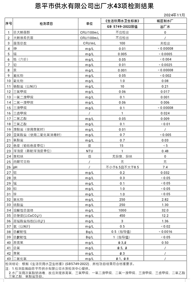 2024年11月出厂水43项检测结果