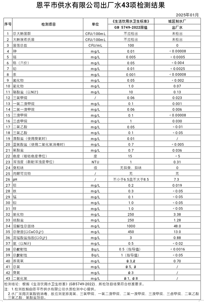 2025年1月出厂水43项检测结果
