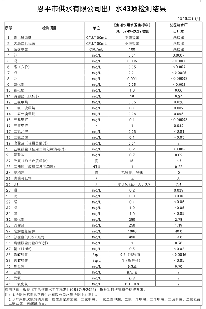 2025年11月出厂水43项检测结果